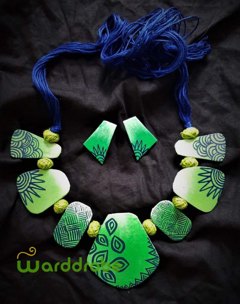 Add a splash of color to your celebrations with this hand‑painted fabric jewellery set. Designed by skilled artisans, the necklace and earrings showcase bold hues and intricate motifs that embody cultural heritage. Lightweight and skin‑friendly, this set ensures you shine at weddings, festivals, or parties.