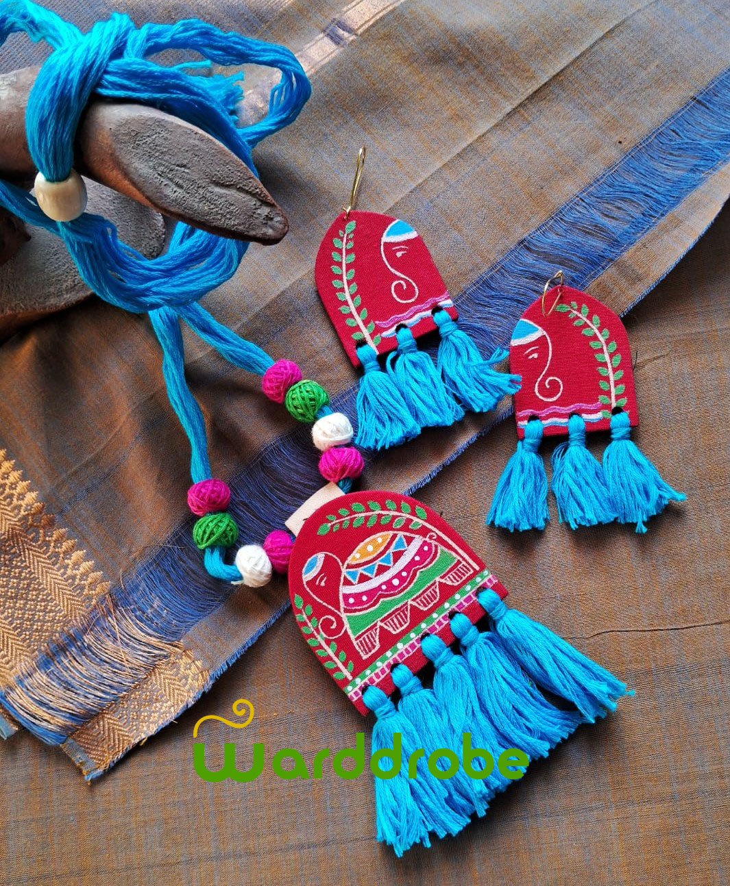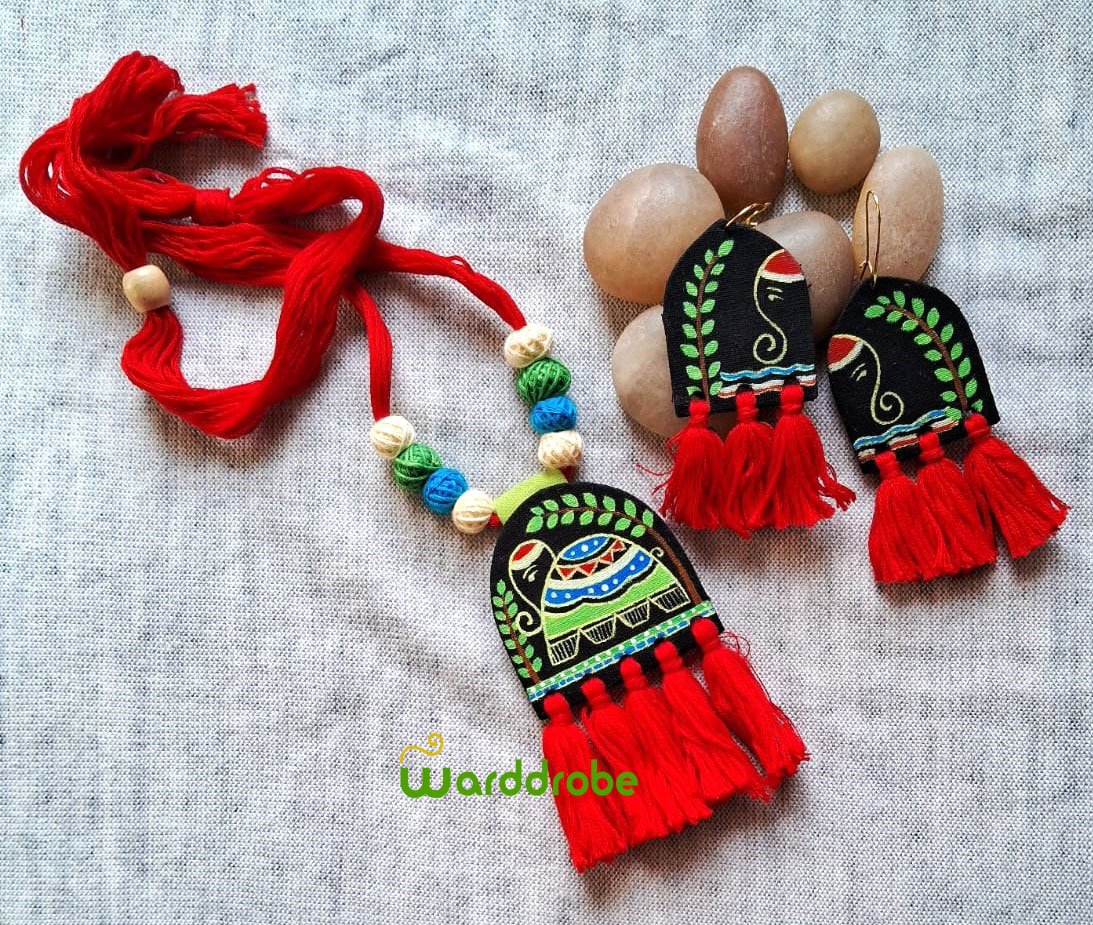 Celebrate conscious fashion with this eco‑friendly handmade jewellery set crafted from fabric and adorned with intricate hand‑painted designs. Each piece reflects authentic craftsmanship, offering comfort and uniqueness. Ideal for pairing with ethnic wear or fusion outfits, this jewellery set makes a thoughtful gift for art lovers.