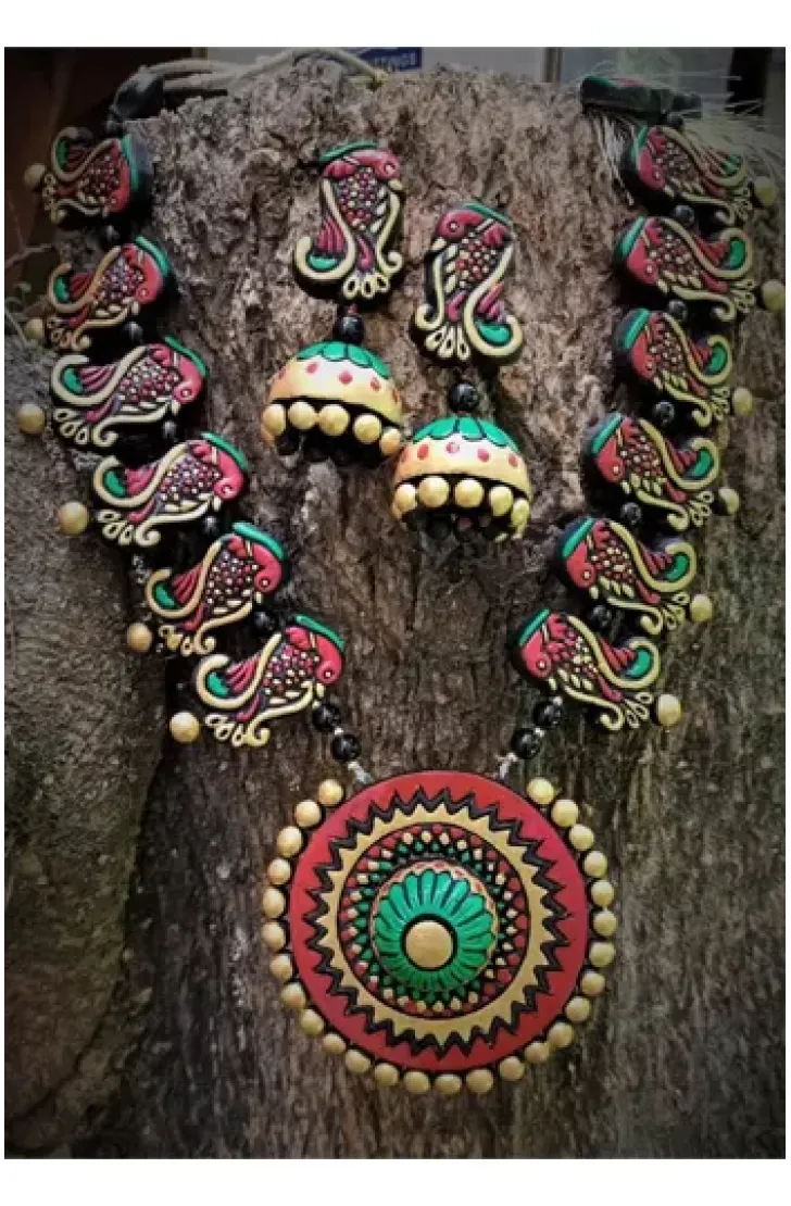 Elevate your style with the Wardrobe Handcrafted Terracotta Jewellery Set. This exquisite necklace and earring set is a celebration of traditional Indian artistry fused with modern sophistication. Each piece is carefully shaped and hand-painted by skilled artisans, resulting in a lightweight, eco-friendly accessory that adds charm to any outfit.